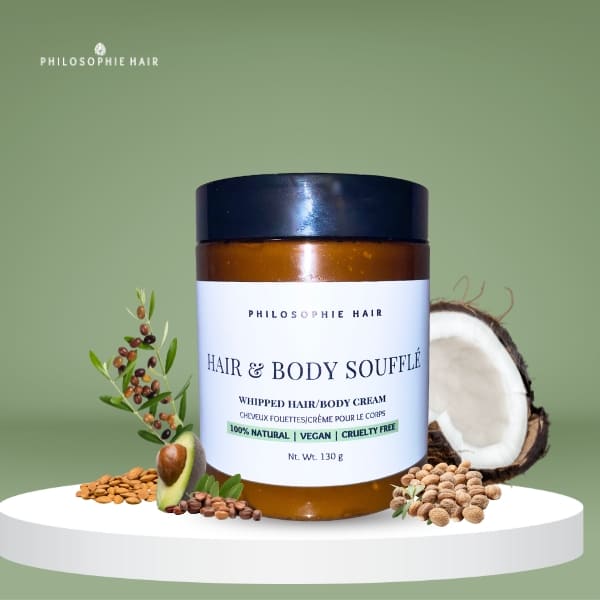 Our Hair & Body Soufflé is the ultimate moisturizing whipped butter that can be used on both your hair and skin. It’s perfect for those with dry skin or hair, and can be used as a leave-in conditioner, moisturizer, or hair mask.